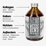 Für unsere Knochenbrühe Pur & Paleo werden Fleischknochen und Nackensehnen vom Bio Weiderind für 48 Stunden bei 80°C schonend ausgekocht. Dadurch lösen sich alle wertvollen Nährstoffe und bleiben in der Brühe erhalten.