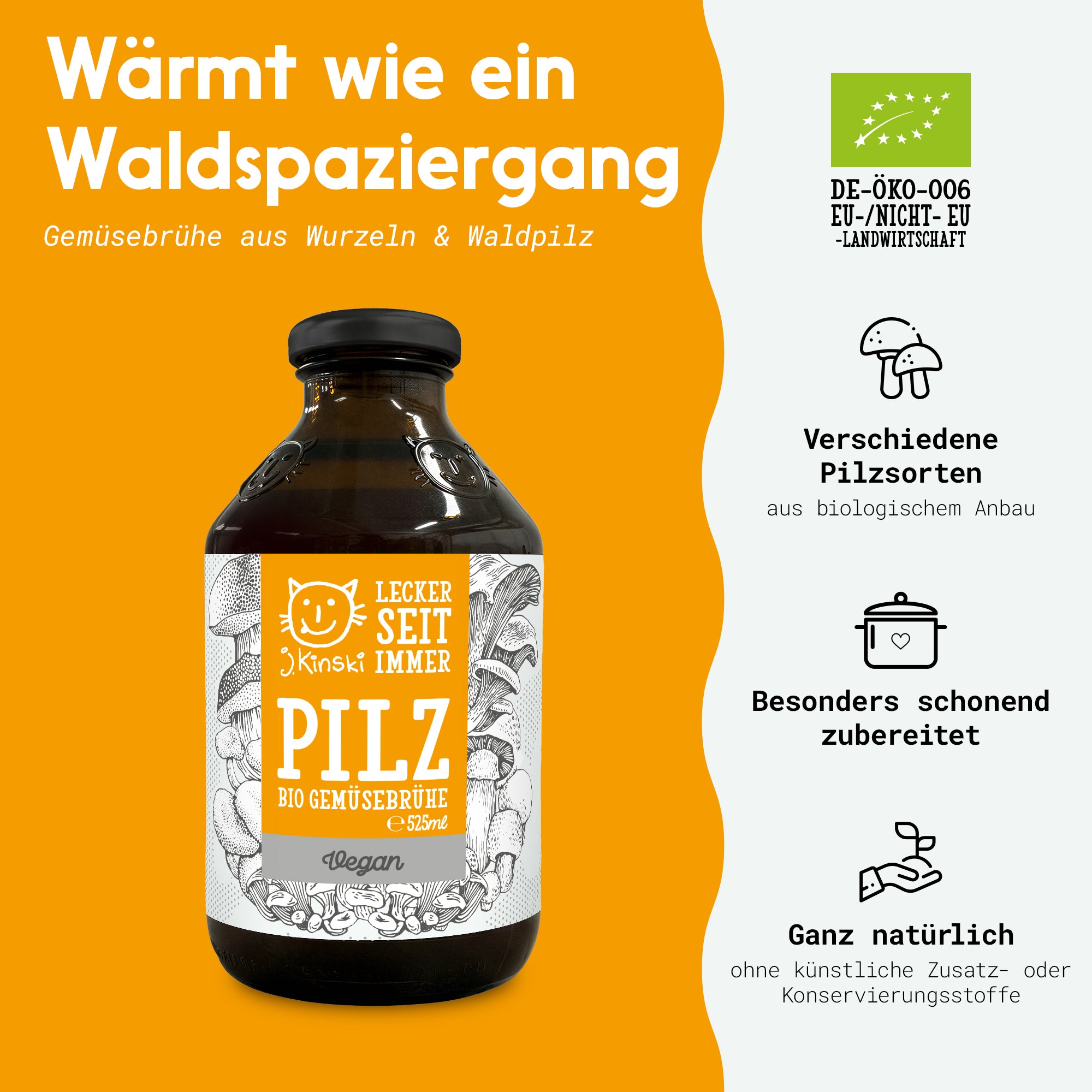 Zutaten: Trinkwasser, Pilze* (Shiitake*, Champignon*, Pfifferling*, Steinpilz* ), Wurzelpetersilie*, Zwiebel*, Pastinake*, Karotte*, Steinsalz, Rübenzucker*, Knoblauch*,Rosmarin*, Weißer Balsamico*(Weißweinessig*, Traubenmost*), Thymian*, Wacholder*, Pfeffer*, Lorbeer*