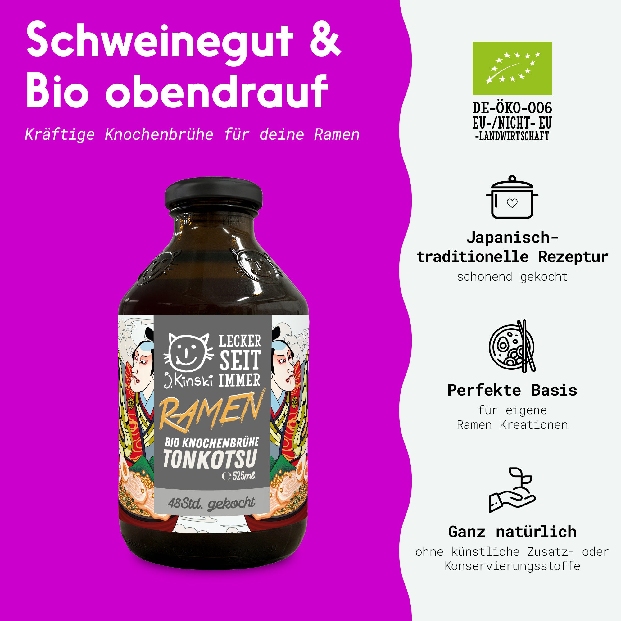 Tonkotsu bezeichnet eine besonders reichhaltige Brühe vom Schwein, die als Basis für Ramen dient. Sie zeichnet sich durch eine trübe, milchige Farbe und sämige Konsistenz aus, die auf den hohen Kollagenanteil zurückzuführen ist. Wir sind aktuell der einzige Hersteller auf dem europäischen Markt, der die enorm aufwendige Herstellung auf sich nimmt, um sie euch in Bioqualität auf den Tisch zu bringen. Dabei gelten die gleichen Qualitätsstandards wie bei all unseren Produkten. Wir verwenden ausschließlich Produkte vom Schwäbisch Hällischen Landschwein. Unsere vertrauten Partner sind dabei die Bäuerliche Erzeugergemeinschaft Schwäbisch Hall (www.besh.de) und Naturland - Verband für ökologischen Landbau e. V. (www.naturland.de).