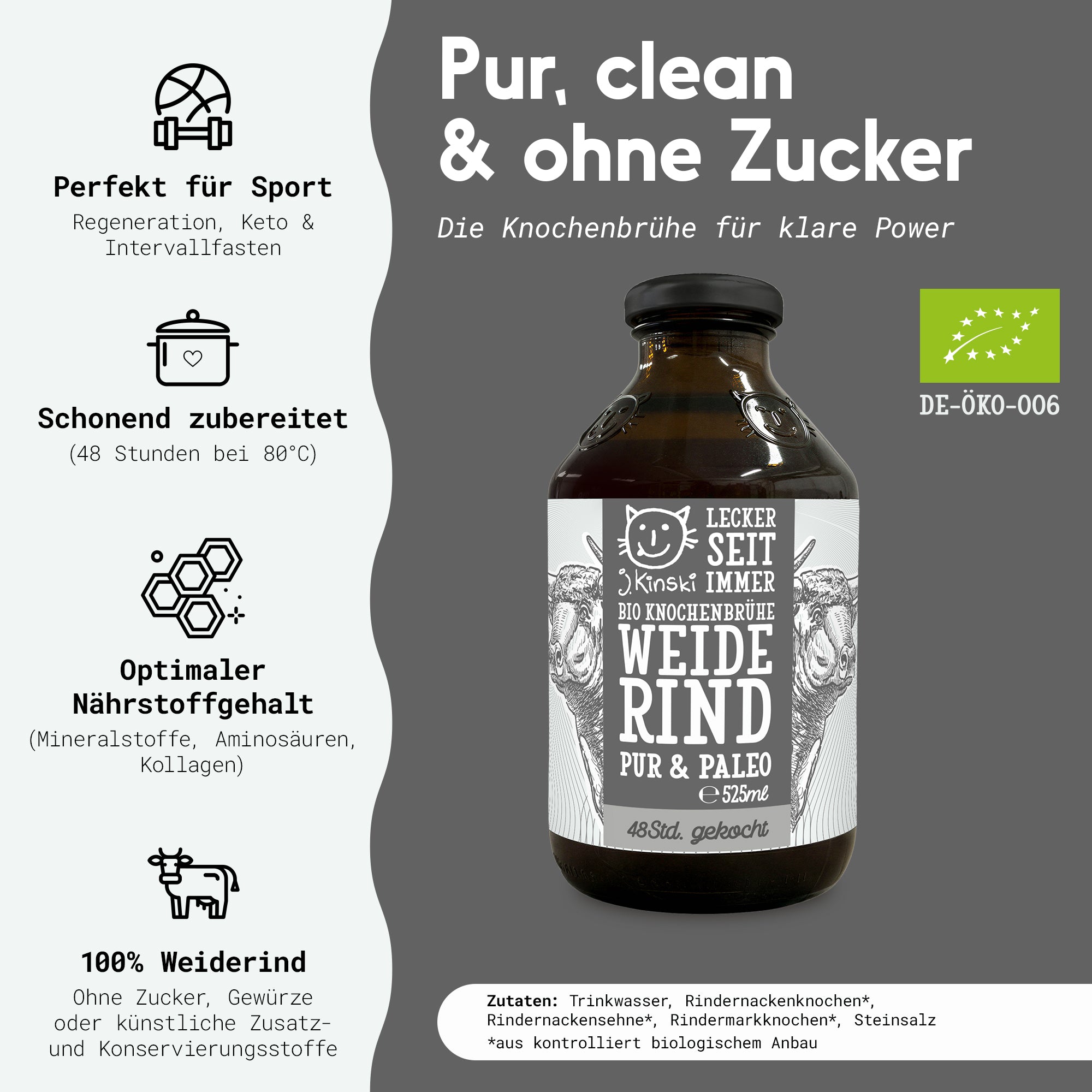 Glückliche Kühe auf saftig grüner Wiese – danach schmeckt unsere Bio Knochenbrühe Weiderind Pur & Paleo. Mehr braucht´s auch gar nicht, vor allem kein Getreide, Zucker oder künstliche Zusatzstoffe. Der einzigartige Geschmack vom freigrasenden Bio Weiderind wird in unserer Brühe nur von seinen beiden kleinen Kumpels Zwiebel und Steinsalz begleitet.