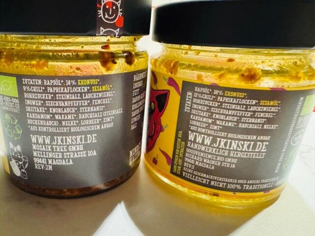 Das Crunch basiert auf Bio Rapsöl und Bio Sesamöl, beides leicht nussig im Geschmack und voller Omega-Fettsäuren. Darin werden zunächst Frühlingszwiebeln, Knoblauch und Gewürze über 24h bei chilligen 70°C gerührt, damit sich alles an ätherischen Ölen daraus lösen kann. In diesem Öl-Upgrade werden anschließend die geschredderten Chilis (das Wichtigste) frittiert. Zusammen mit den restlichen Zutaten rühren wir das Ganze noch 2 Tage weiter, bis es reif für´s Glas ist.