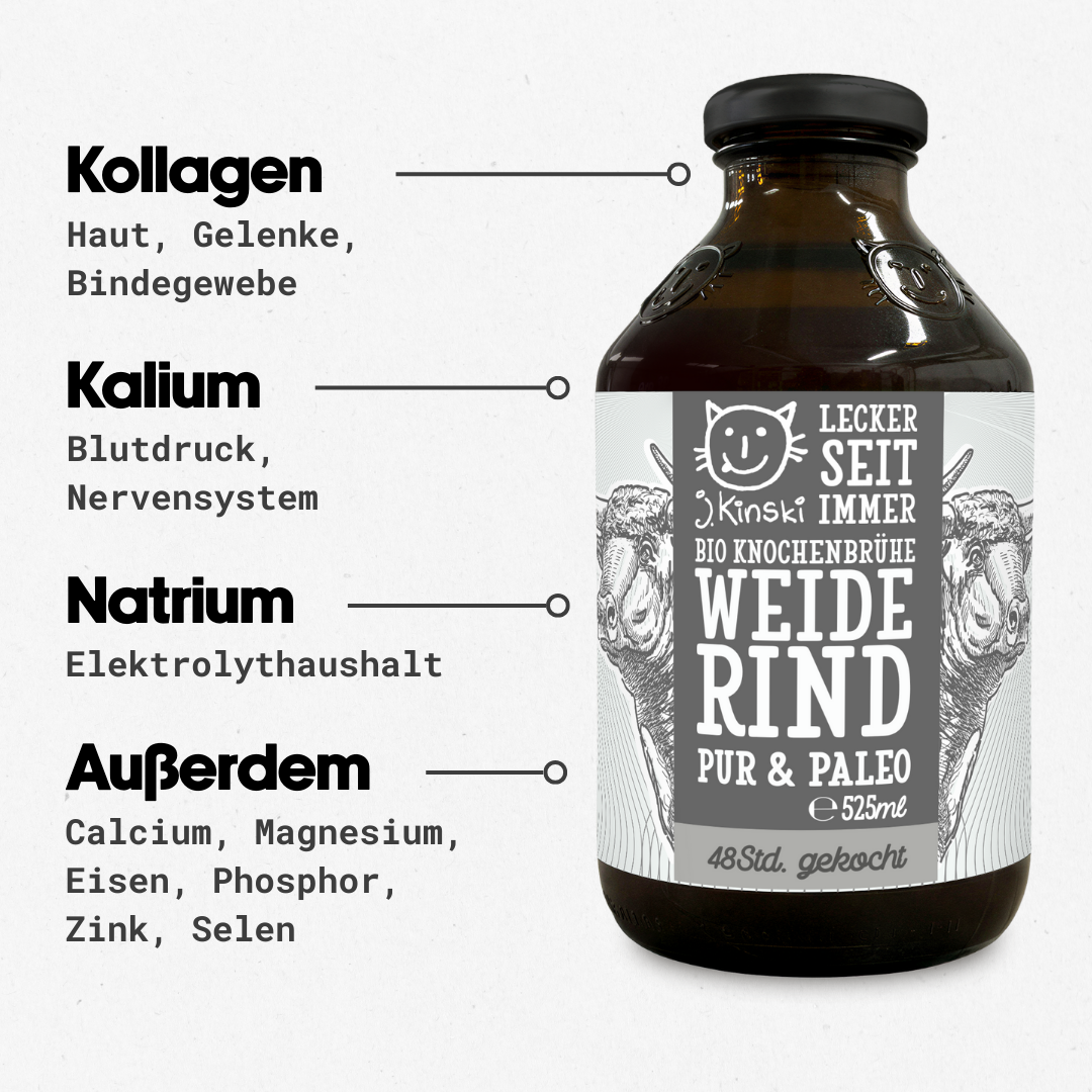 Viele andere Brühenhersteller benutzen Fleisch- oder Knochenmehl, um die Brühe günstig und schnell herzustellen. Wir kochen sie ganz wie zu Omas Zeiten mit viel Geduld und ganz ohne Tricks aus echten Knochen, Fleisch und Sehnen. Außerdem kennen wir die Lieferanten von tierischen und pflanzlichen Rohstoffen, weil Tierwohl, faire Entlohnung der Lieferanten sowie Nachhaltigkeit für uns eine große Rolle spielen und nicht nur leere Marketingphrasen sind.