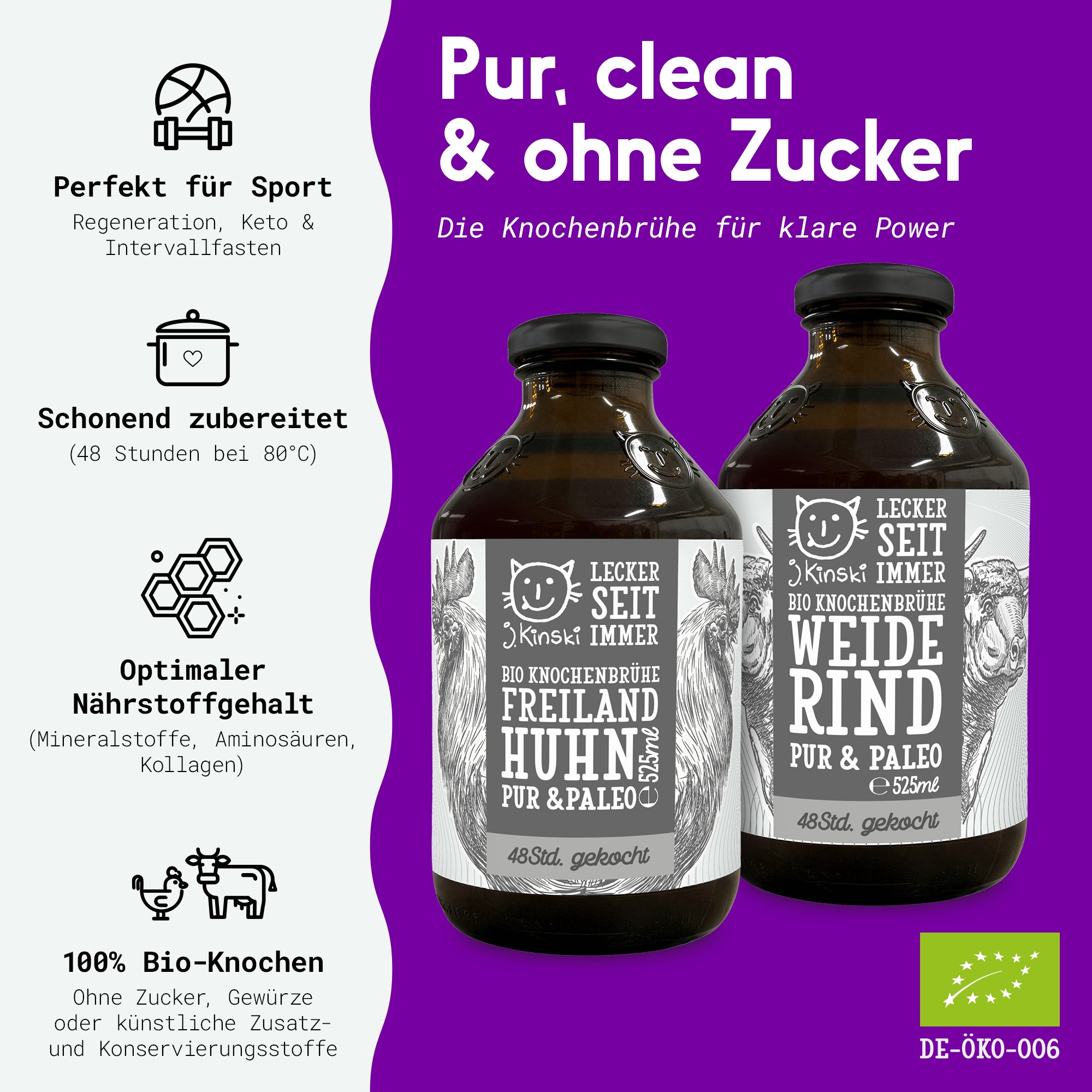 Geschmacksrichtung: ‘Back to the Roots’. Das beschreibt unsere Bio Knochenbrühen Pur & Paleo ziemlich treffend - weil genauso isses. Inspiriert von der Paleo-Ernährung, kommen diese Brühen nämlich mit ganzen 4 Zutaten aus und der natürliche Geschmack vom Huhn und Weiderind damit voll zur Geltung. Allergiker und Menschen mit Unverträglichkeiten lieben diesen Trick.
