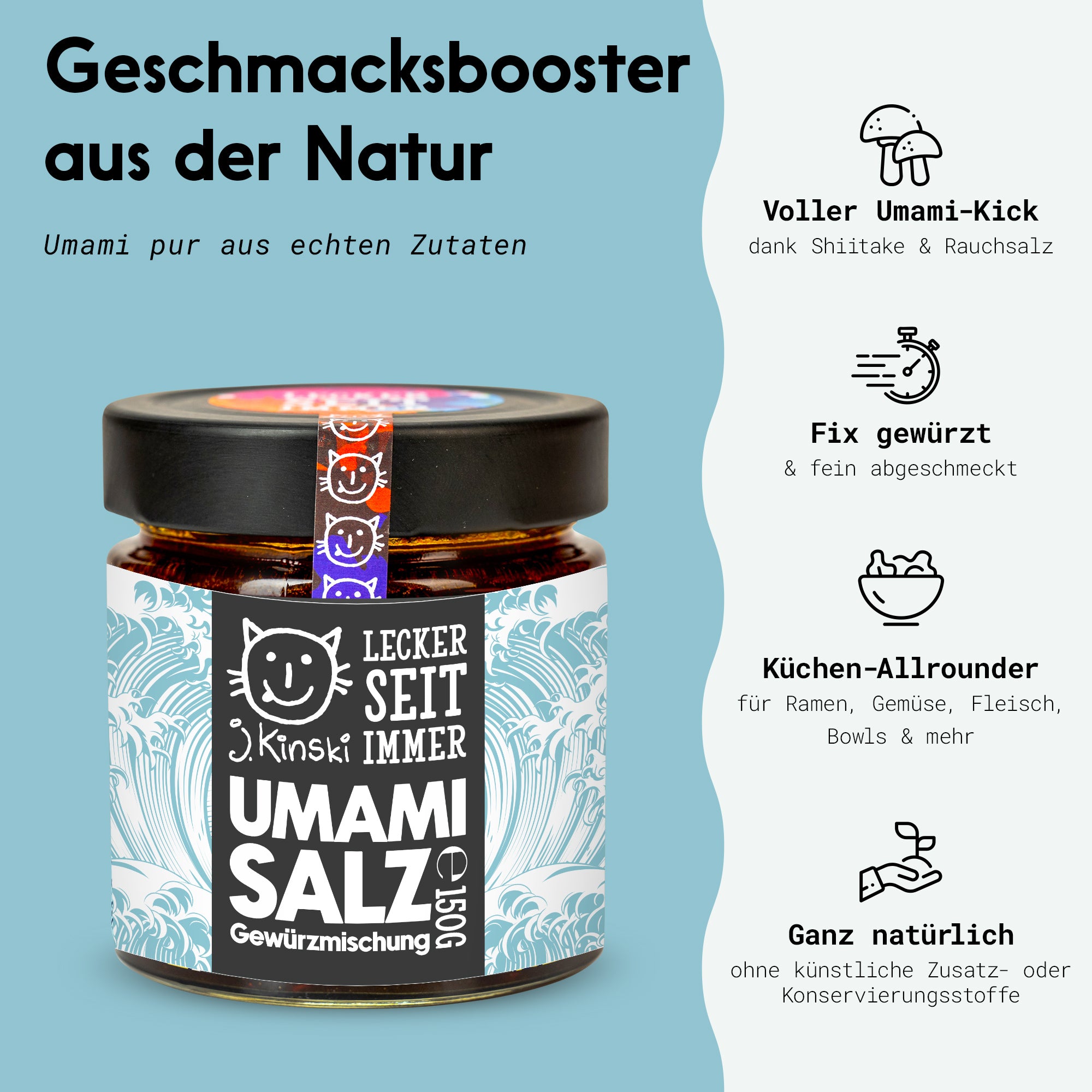 Wer einmal unser Umami Salz probiert hat, wird möglicherweise nie wieder normales Salz verwenden. Eine Prise davon öffnet nämlich Geschmacksknospen, von denen ihr garnicht wusstet, dass ihr sie habt. Lasst euch diesen Zungenschmeichler nicht entgehen!